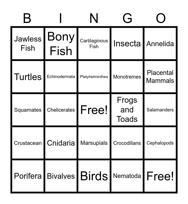 This bingo card has a free space and 24 words: Porifera, Cnidaria, Platyhelminthes, Nematoda, Annelida, Jawless Fish, Bony Fish, Cartilaginous Fish, Frogs and Toads, Salamanders, Squamates, Echinodermata, Crocodilians, Cephalopods, Turtles, Bivalves, Birds, Insecta, Placental Mammals, Crustacean, Chelicerates, Marsupials, Monotremes and Free!.