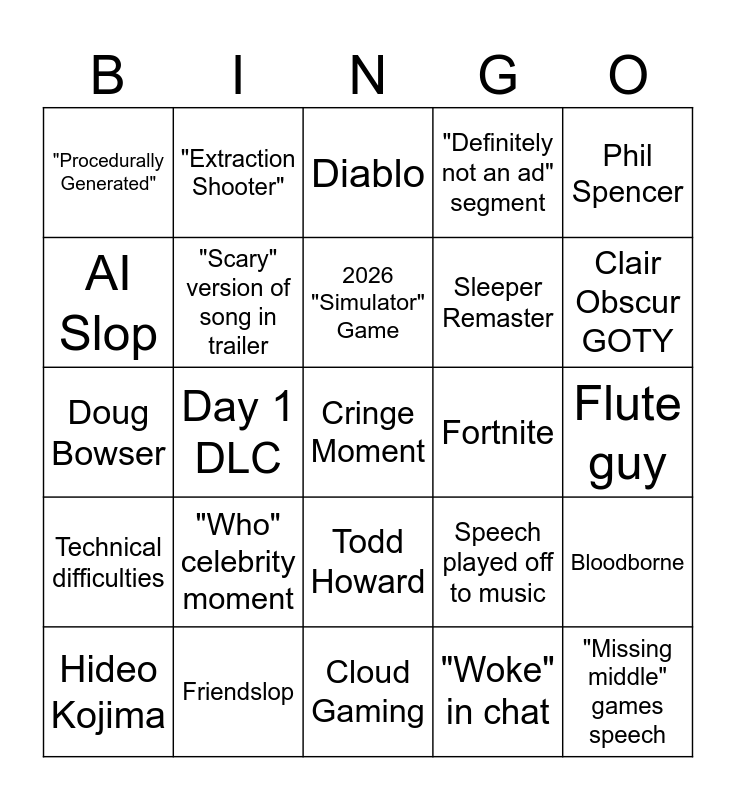 This bingo card has a free space and 24 words: "Who" celebrity moment, Friendslop, 2026 "Simulator" Game, Hideo Kojima, Phil Spencer, "Procedurally Generated", AI Slop, "Extraction Shooter", Fortnite, Todd Howard, Sleeper Remaster, Doug Bowser, Speech played off to music, Bloodborne, "Scary" version of song in trailer, "Woke" in chat, Flute guy, Diablo, Clair Obscur GOTY, Day 1 DLC, "Missing middle" games speech, Technical difficulties, "Definitely not an ad" segment and Cloud Gaming.