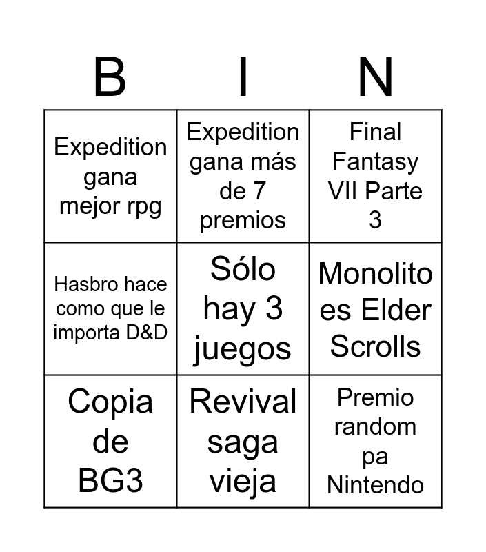 This bingo card has a free space and 8 words: Monolito es Elder Scrolls, Final Fantasy VII Parte 3, Expedition gana más de 7 premios, Copia de BG3, Expedition gana mejor rpg, Premio random pa Nintendo, Hasbro hace como que le importa D&D and Revival saga vieja.