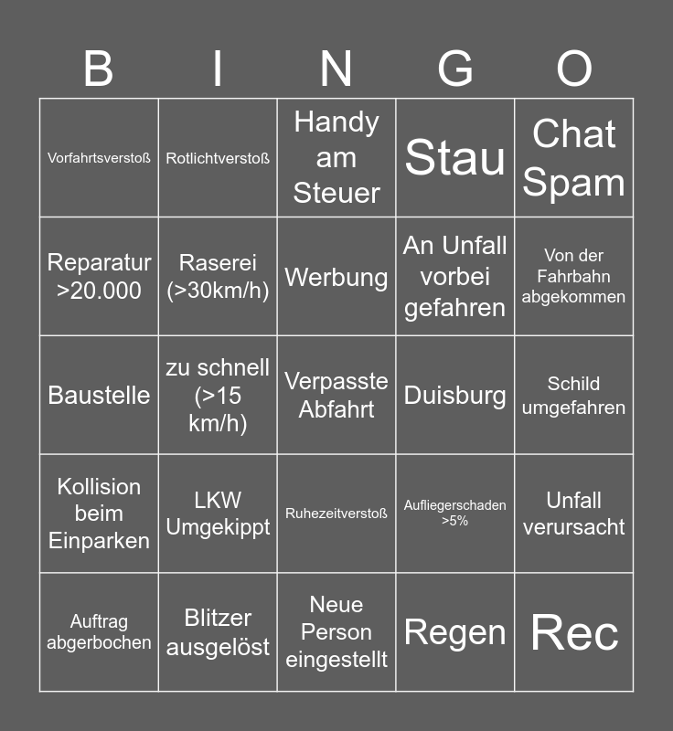 This bingo card has 25 words: LKW Umgekippt, Neue Person eingestellt, Werbung, Auftrag abgerbochen, Chat Spam, Vorfahrtsverstoß, Reparatur >20.000, Rotlichtverstoß, Duisburg, Ruhezeitverstoß, An Unfall vorbei gefahren, Baustelle, Aufliegerschaden >5%, Unfall verursacht, Raserei (>30km/h), Rec, Schild umgefahren, Handy am Steuer, Von der Fahrbahn abgekommen, zu schnell (>15 km/h), Verpasste Abfahrt, Blitzer ausgelöst, Kollision beim Einparken, Stau and Regen.