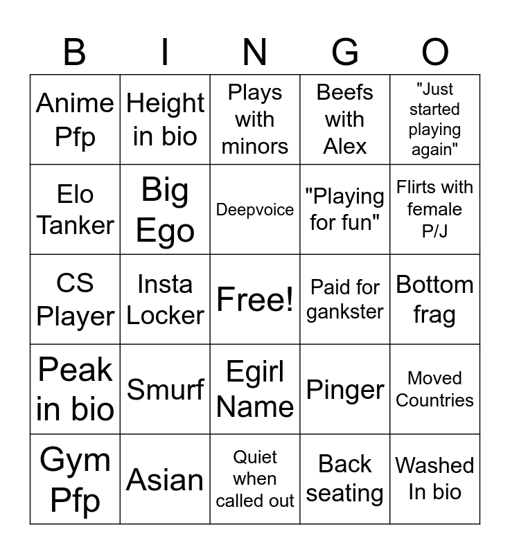This bingo card has a free space and 24 words: Smurf, Asian, Deepvoice, Gym Pfp, "Just started playing again", Anime Pfp, Elo Tanker, Height in bio, Paid for gankster, Egirl Name, "Playing for fun", CS Player, Pinger, Moved Countries, Big Ego, Back seating, Bottom frag, Plays with minors, Flirts with female P/J, Insta Locker, Washed In bio, Peak in bio, Beefs with Alex and Quiet when called out.
