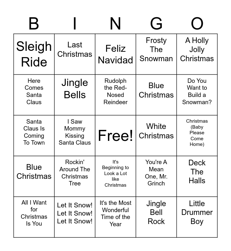 This bingo card has a free space and 24 words: All I Want for Christmas Is You, Rockin' Around The Christmas Tree, Rudolph the Red-Nosed Reindeer, Jingle Bell Rock, A Holly Jolly Christmas, Sleigh Ride, Last Christmas, Feliz Navidad, White Christmas, Christmas (Baby Please Come Home), Santa Claus Is Coming To Town, Jingle Bells, You're A Mean One, Mr. Grinch, Deck The Halls, Here Comes Santa Claus, Let It Snow! Let It Snow! Let It Snow!, It's the Most Wonderful Time of the Year, Frosty The Snowman, Do You Want to Build a Snowman?, Blue Christmas, I Saw Mommy Kissing Santa Claus, It's Beginning to Look a Lot like Christmas, Blue Christmas and Little Drummer Boy.