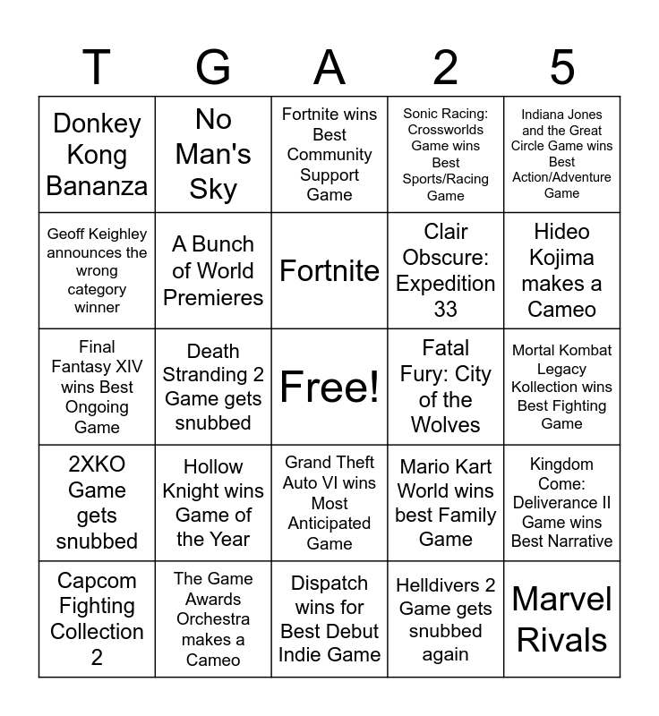 This bingo card has a free space and 24 words: Hollow Knight wins Game of the Year, The Game Awards Orchestra makes a Cameo, Fortnite, Capcom Fighting Collection 2, Indiana Jones and the Great Circle Game wins Best Action/Adventure Game, Donkey Kong Bananza, Geoff Keighley announces the wrong category winner, No Man's Sky, Fatal Fury: City of the Wolves, Grand Theft Auto VI wins Most Anticipated Game, Clair Obscure: Expedition 33, Final Fantasy XIV wins Best Ongoing Game, Mario Kart World wins best Family Game, Kingdom Come: Deliverance II Game wins Best Narrative, A Bunch of World Premieres, Helldivers 2 Game gets snubbed again, Mortal Kombat Legacy Kollection wins Best Fighting Game, Fortnite wins Best Community Support Game, Hideo Kojima makes a Cameo, Death Stranding 2 Game gets snubbed, Marvel Rivals, 2XKO Game gets snubbed, Sonic Racing: Crossworlds Game wins Best Sports/Racing Game and Dispatch wins for Best Debut Indie Game.