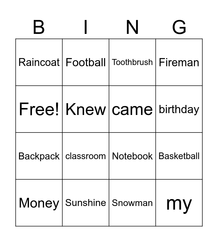 This bingo card has 16 words: Sunshine, Basketball, Toothbrush, Raincoat, Backpack, Football, Notebook, Snowman, Free!, Knew, Money, Fireman, classroom, birthday, came and my.