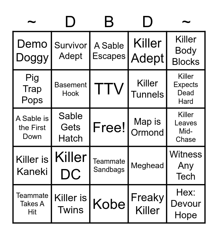 This bingo card has a free space and 24 words: Killer DC, Killer is Twins, TTV, Teammate Takes A Hit, Killer Body Blocks, Demo Doggy, Pig Trap Pops, Survivor Adept, Map is Ormond, Teammate Sandbags, Killer Tunnels, A Sable is the First Down, Meghead, Witness Any Tech, Basement Hook, Freaky Killer, Killer Leaves Mid-Chase, A Sable Escapes, Killer Expects Dead Hard, Sable Gets Hatch, Hex: Devour Hope, Killer is Kaneki, Killer Adept and Kobe.