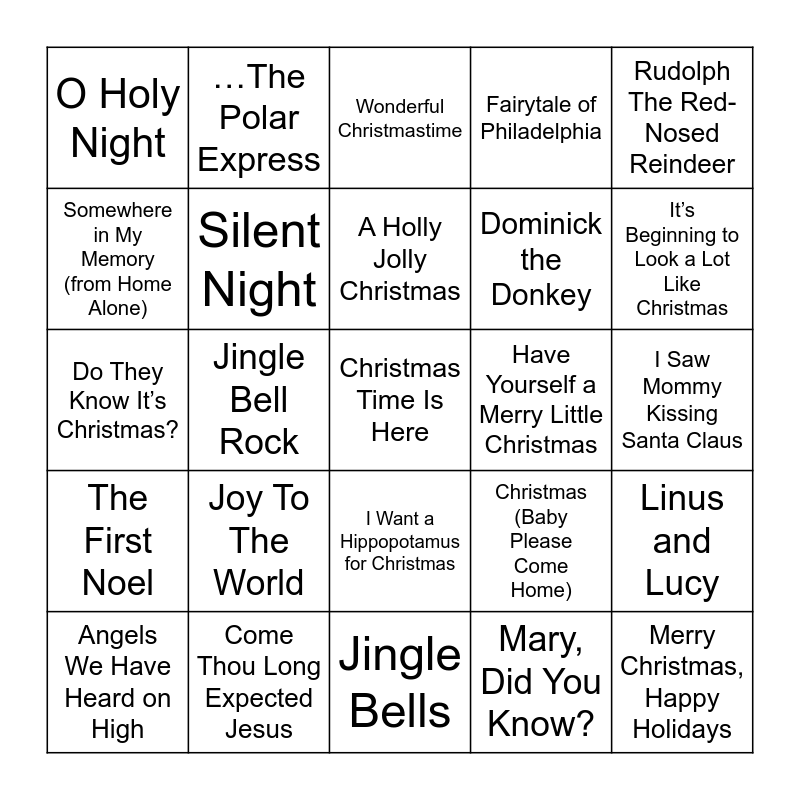 This bingo card has 65 words: All I Want For Christmas Is You, Underneath the Tree, Christmas Wrapping, Linus and Lucy, Last Christmas, You’re A Mean One, Mr. Grinch, …The Polar Express, Let It Snow! Let It Snow! Let It Snow!, A Holly Jolly Christmas, Rockin’ Around the Christmas Tree, I Want a Hippopotamus for Christmas, Grandma Got Run Over By A Reindeer, I Saw Mommy Kissing Santa Claus, Rudolph The Red-Nosed Reindeer, Dance of the Sugar Plum Fairy, Somewhere in My Memory (from Home Alone), Jingle Bell Rock, O Holy Night, Christmas Eve/Sarajevo 12/24, Dominick the Donkey, Joy To The World, The First Noel, Fairytale of Philadelphia, Merry Christmas, Please Don’t Call, The 12 Days of Christmas, White Winter Hymnal, The Little Drummer Boy, God Rest Ye Merry, Gentlemen, Christmas Time Is Here, When Christmas Comes to Town, Angels We Have Heard on High, Kidnap the Sandy Claws, Christmas Truce, The Nutcracker, Waltz of the Snowflakes, Christmas (Baby Please Come Home), Come Thou Long Expected Jesus, O Come O Come Emmanuel, Do They Know It’s Christmas?, Mary, Did You Know?, Christmas in Hollis, Silent Night, Santa Claus Is Coming To Town, Have Yourself a Merry Little Christmas, Christmas All Over Again, Oi To the World, Hark! The Herald Angels Sing, It’s Beginning to Look a Lot Like Christmas, Sleigh Ride, Merry Christmas, Happy Holidays, Happy Xmas (War Is Over), Scrooge, One More Sleep ‘Til Christmas, Thankful Heart, Jingle Bells, Baby, It’s Cold Outside, Where Are You Christmas, Santa Tell Me, Wonderful Christmastime, Christmas Tree Farm, Do You Hear What I Hear?, Santa, Can’t You Hear Me, Silver Bells, What’s This?, Run Rudolph Run and The Christmas Song (Merry Christmas To You).