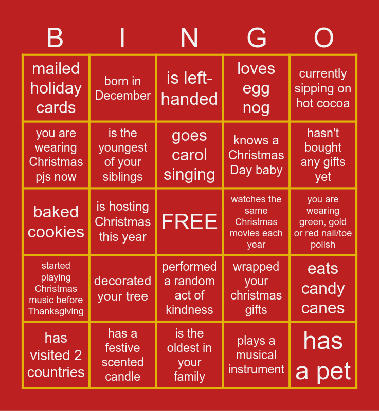 This bingo card has a free space and 24 words: decorated your tree, has a festive scented candle, goes carol singing, has visited 2 countries, currently sipping on hot cocoa, mailed holiday cards, you are wearing Christmas pjs now, born in December, watches the same Christmas movies each year, performed a random act of kindness, knows a Christmas Day baby, baked cookies, wrapped your christmas gifts, eats candy canes, is the youngest of your siblings, plays a musical instrument, you are wearing green, gold or red nail/toe polish, is left-handed, hasn't bought any gifts yet, is hosting Christmas this year, has a pet, started playing Christmas music before Thanksgiving, loves egg nog and is the oldest in your family.