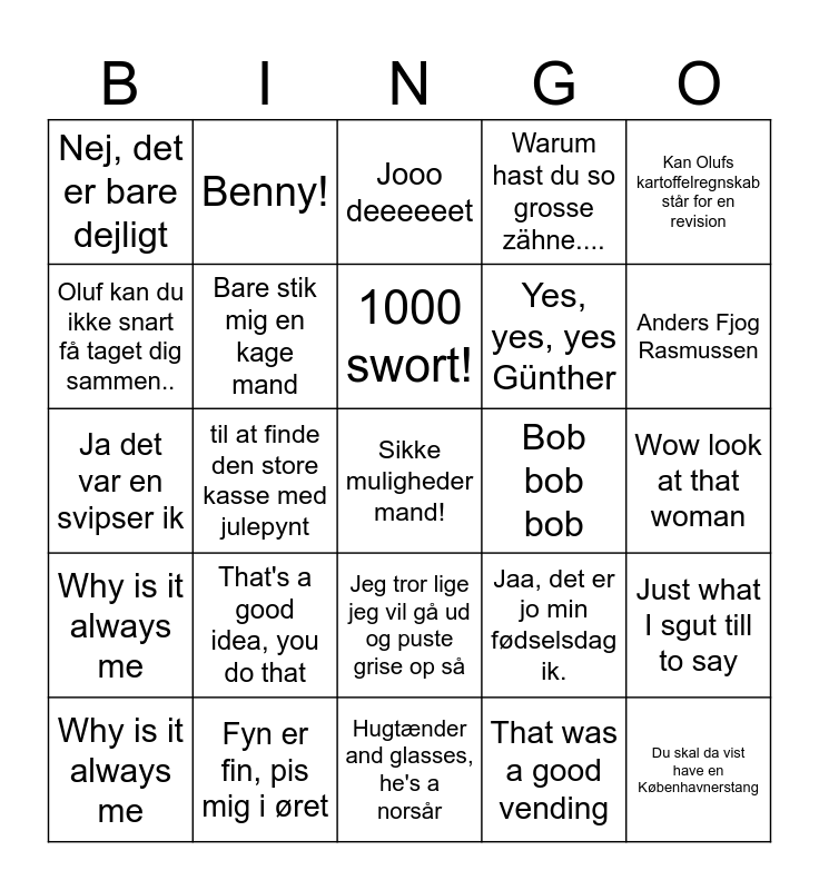 This bingo card has 67 words: Günther is gown gak!, Sehr bertümte sporhund, What's what?, Just what I sgut till to say, Det er bare dæjligt, Ja vi må da håbe det bliver bedre i morgen, Benny!, Kvittering, ejjj det tror jeg ikke rigtigt kan svare sig, 1000 swort!, Der er bare dejligt, Jeg tror lige jeg vil gå ud og puste grise op så, Siiiit Günther, Wow look at that woman, Kan Olufs kartoffelregnskab står for en revision, Benny, skal du ett drikke din kaffe?, Oluf kan du ikke snart få taget dig sammen.., til at finde den store kasse med julepynt, Nej, det er bare dejligt, Kaffekanden den er sprunget i luften, Yes, yes, yes Günther, That's a good idea, you do that, Why is it always me, Warum hast du so grosse zähne...., That was a good vending, Gown glip and gown glip, Maybe we can use that in another afsnit., How dælen do we do that?, It's hard to be a nissemand!, Anders Fjog Rasmussen, Jeg har aldrig oplevet noget lignende, Sikke muligheder mand!, Det var da lige godt grove, How much is the clock, It's lige nøjagtigt late, Nååårh yes, Why is it always me, Because you are the one...., Jaa, det er jo min fødselsdag ik., Ja det var en svipser ik, Du skal da vist have en Københavnerstang, Nu ikke så meget fis med dig, Bare stik mig en kage mand, Bob bob bob, Du skal da ha en kaffepunch, Skål do, Du skal da have en skvis mere i, Oh ha, der er nu et noget som sårn Rød Voldborg., Fyn er fin, pis mig i øret, Yes, it's the kartoffelwoman, Det sagde hun også i går, Jooo deeeeeet, Take you together Hansi, Det skal et komme an o' det da., Ja, det er bare dæjligt., Skål Benny, Hugtænder and glasses, he's a norsår, Kæft hvor is he da ugly, Ser du ikke lidt skidt ud Benny?, Come over here., Shhh I am sinkig!, Snakke i den store telefon, Jeg tror et liiige jeg skal have noget i daw, Søster lagkage!, Nu holder du lige kæft ik!, Bønder, pis mig i øret!, Slå et søm i en lort and pikkel av!.