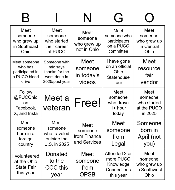 This bingo card has a free space and 61 words: Get photo taken at PUCO logo background, Donated to the CCC this year, Meet PUCO staff with 20+ years, Meet someone born in a foreign country, Attended 2 or more PUCO Knowledge Connections this year, Attended one or more MAPS classes, Someone with mic says thanks for the work done in 2025/past year, Meet someone with LeanOhio certification, I have gone on an official Ohio Statehouse tour, Someone’s phone rings during the All Staff meeting, Meet someone who participates on a PUCO committee, Meet someone who attended a professional sporting event, Meet someone who has participated in a PUCO blood drive, Meet someone who grew up in Northwest Ohio, Meet someone who grew up in Northeast Ohio, Meet someone who grew up in Southeast Ohio, Meet someone who grew up in Southwest Ohio, Meet someone who grew up in Central Ohio, Meet someone you didn’t know before today, Meet someone in today's videos, Meet someone who drove 1+ hour today, Meet someone who grew up not in Ohio, I volunteered at the Ohio State Fair this year, Someone born in April (not you), Reshare a PUCO social media post, Everyone claps, Play all staff trivia, Brought a canned good today, Meet resource fair vendor, Meet a department director, Meet a pickleball player, Ask someone “What is your favorite holiday?”, Ask someone “What is your favorite season?”, Coffee runs out, Meet someone who started their career at PUCO, Meet someone who has led a Knowledge Connection course, Meet someone serving in the armed forces, Meet a veteran, Meet someone who went to a Columbus Clippers game this year, Follow @PUCOhio on Facebook, X, and Insta, I attended PUCO/OPSB official voting session this year, Meet someone who traveled outside the U.S. in 2025, Meet someone who started at the PUCO in 2025, Someone wearing a PUCO shirt, Meet someone from Legal, Meet someone from OPA/Legislative Services, Meet someone from SMED, Meet someone from Docketing, Meet someone from Federal Energy Advocate, Meet someone from Finance and Services, Meet someone from OPSB, Meet someone from IT, Meet a member of the Transportation, Meet someone from Rates and Analysis, Meet someone from Human Resources, Meet someone who has a pet, Find someone who speaks more than one language, Find someone who shares a birthday month with you, Find someone who has gone to a concert in 2025, Find someone who is a SCUBA certified and Find someone who has run a marathon.