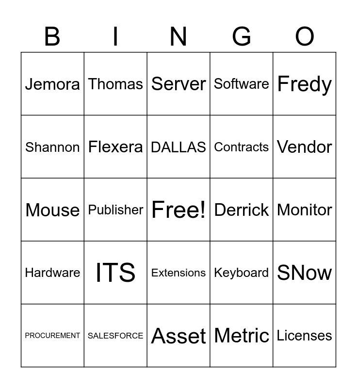 This bingo card has a free space and 24 words: ITS, SALESFORCE, DALLAS, PROCUREMENT, Fredy, Jemora, Shannon, Thomas, Derrick, Extensions, Contracts, Mouse, Keyboard, SNow, Flexera, Metric, Monitor, Server, Vendor, Publisher, Licenses, Hardware, Software and Asset.