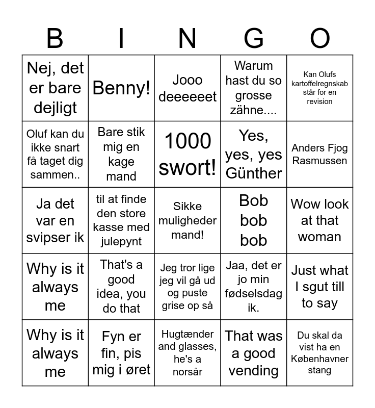 This bingo card has 67 words: Günther is gown gak!, Sehr bertümte sporhund, What's what?, Just what I sgut till to say, Det er bare dæjligt, Ja vi må da håbe det bliver bedre i morgen, Benny!, Kvittering, ejjj det tror jeg ikke rigtigt kan svare sig, 1000 swort!, Der er bare dejligt, Jeg tror lige jeg vil gå ud og puste grise op så, Siiiit Günther, Wow look at that woman, Kan Olufs kartoffelregnskab står for en revision, Benny, skal du ett drikke din kaffe?, Oluf kan du ikke snart få taget dig sammen.., til at finde den store kasse med julepynt, Nej, det er bare dejligt, Kaffekanden den er sprunget i luften, Yes, yes, yes Günther, That's a good idea, you do that, Why is it always me, Warum hast du so grosse zähne...., That was a good vending, Gown glip and gown glip, Maybe we can use that in another afsnit., How dælen do we do that?, It's hard to be a nissemand!, Anders Fjog Rasmussen, Jeg har aldrig oplevet noget lignende, Sikke muligheder mand!, Det var da lige godt grove, How much is the clock, It's lige nøjagtigt late, Nååårh yes, Why is it always me, Because you are the one...., Jaa, det er jo min fødselsdag ik., Ja det var en svipser ik, Du skal da vist ha en Københavner stang, Nu ikke så meget fis med dig, Bare stik mig en kage mand, Bob bob bob, Du skal da ha en kaffepunch, Skål do, Du skal da have en skvis mere i, Oh ha, der er nu et noget som sårn Rød Voldborg., Fyn er fin, pis mig i øret, Yes, it's the kartoffelwoman, Det sagde hun også i går, Jooo deeeeeet, Take you together Hansi, Det skal et komme an o' det da., Ja, det er bare dæjligt., Skål Benny, Hugtænder and glasses, he's a norsår, Kæft hvor is he da ugly, Ser du ikke lidt skidt ud Benny?, Come over here., Shhh I am sinkig!, Snakke i den store telefon, Jeg tror et liiige jeg skal have noget i daw, Søster lagkage!, Nu holder du lige kæft ik!, Bønder, pis mig i øret!, Slå et søm i en lort and pikkel av!.