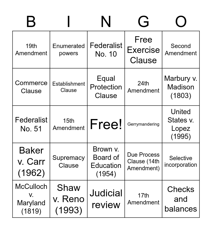 This bingo card has a free space and 47 words: Federalism, Checks and balances, Separation of powers, Judicial review, Supremacy Clause, Necessary and Proper Clause (Elastic Clause), Enumerated powers, Implied powers, Commerce Clause, Writ of mandamus, Establishment Clause, Free Exercise Clause, Selective incorporation, Due Process Clause (14th Amendment), Procedural due process, Sixth Amendment, Equal Protection Clause, Gerrymandering, Majority-minority district, Second Amendment, 15th Amendment, 17th Amendment, 19th Amendment, 24th Amendment, 26th Amendment, Marbury v. Madison (1803), McCulloch v. Maryland (1819), Schenck v. United States (1919), Brown v. Board of Education (1954), Baker v. Carr (1962), Engel v. Vitale (1962), Gideon v. Wainwright (1963), Tinker v. Des Moines (1969), New York Times Co. v. United States (1971), Wisconsin v. Yoder (1972), Shaw v. Reno (1993), United States v. Lopez (1995), McDonald v. Chicago (2010), Declaration of Independence, Articles of Confederation, Constitution of the United States, Federalist No. 10, Federalist No. 51, Federalist No. 70, Federalist No. 78, Brutus No. 1 and Letter from a Birmingham Jail.