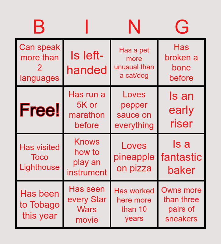 This bingo card has 16 words: Has seen every Star Wars movie, Is a fantastic baker, Has a pet more unusual than a cat/dog, Can speak more than 2 languages, Has visited Toco Lighthouse, Is left-handed, Loves pineapple on pizza, Has worked here more than 10 years, Free!, Has run a 5K or marathon before, Has been to Tobago this year, Has broken a bone before, Knows how to play an instrument, Is an early riser, Loves pepper sauce on everything and Owns more than three pairs of sneakers.