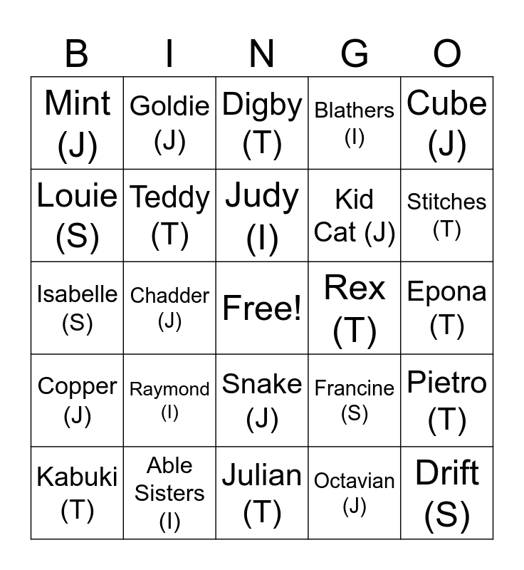 This bingo card has a free space and 76 words: Cousteau (I), Audie (S), Digby (T), Agent S (J), Eugene (I), Apollo (S), Mac (T), Ankha (J), Mira (I), Del (S), Poncho (T), Butch (J), Judy (I), Louie (S), Wolfgang (T), Chadder (J), Redd (I), Drift (S), Marshal (T), Cube (J), Tom Nook (I), Isabelle (S), Teddy (T), Goldie (J), Blathers (I), Walt (S), Kapp’n (T), Jay (J), Ribbot (I), Chrissy (S), Sprocket (T), Ketchup (J), Villager (I), Francine (S), Stitches (T), Kid Cat (J), Hans (I), Wolf Link (S), Epona (T), Octavian (J), Ellie (I), Woolio (S), Coco (T), Stinky (J), Vesta (I), Medli (S), Kabuki (T), Mint (J), Ken (I), June (S), Lucky (T), Snake (J), Brewster (I), Hopper (S), Papi (T), Tangy (J), Erik (I), Tiansheng (S), Punchy (T), Walker (J), Raymond (I), Flossie (S), Sydney (T), Zucker (J), Rover (I), Claudia (S), Rex (T), Mr. Resetti (J), Tommy and Timmy Nook (I), Zipper T. Bunny (S), Pietro (T), Copper (J), Able Sisters (I), Franklin the Turkey (S), Julian (T) and Roscoe (J).