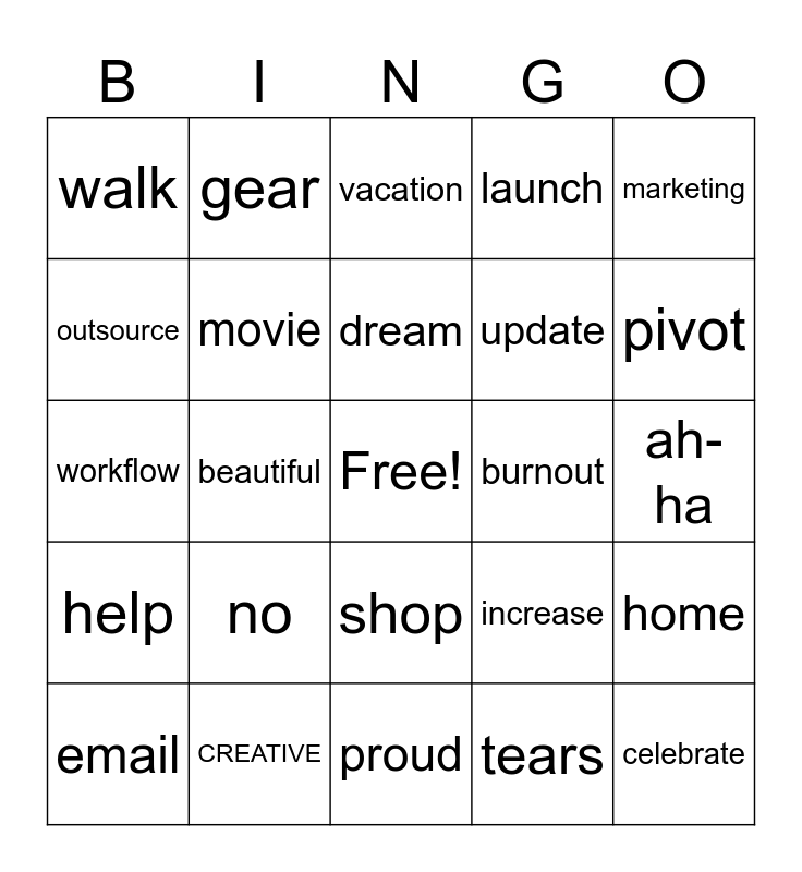 This bingo card has a free space and 30 words: CREATIVE, early, beautiful, book, walk, vacation, movie, shop, burnout, proud, ah-ha, celebrate, tears, obsessed, pivot, rest, increase, help, no, marketing, workflow, white space, gear, update, outsource, launch, home, email, dream and raised.