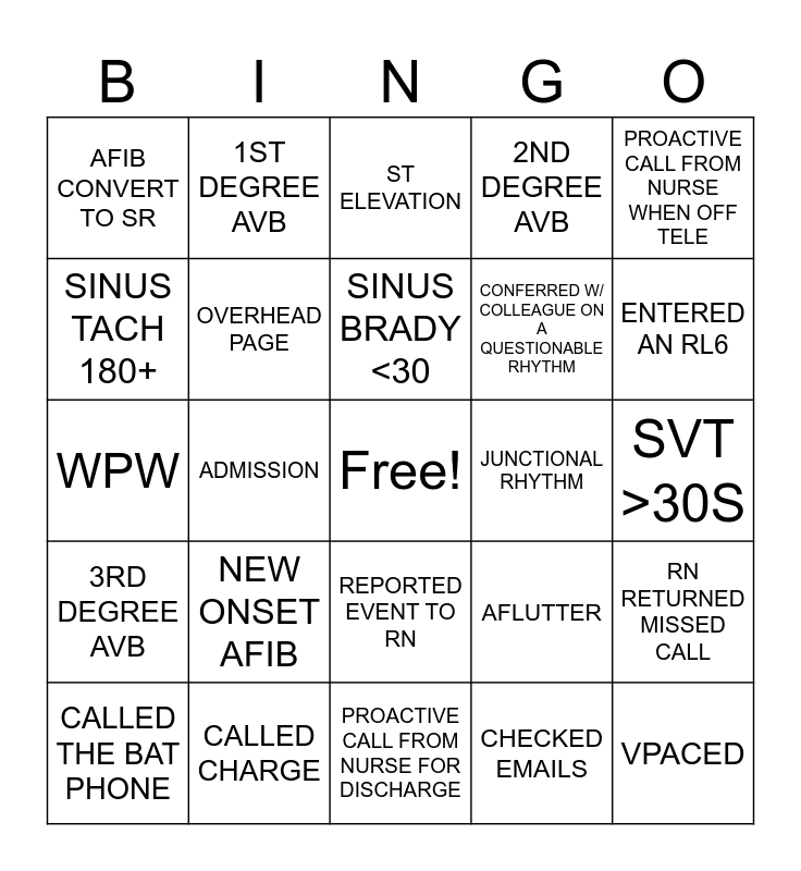This bingo card has a free space and 24 words: NEW ONSET AFIB, CALLED CHARGE, SINUS BRADY <30, CALLED THE BAT PHONE, PROACTIVE CALL FROM NURSE WHEN OFF TELE, AFIB CONVERT TO SR, SINUS TACH 180+, 1ST DEGREE AVB, JUNCTIONAL RHYTHM, REPORTED EVENT TO RN, CONFERRED W/ COLLEAGUE ON A QUESTIONABLE RHYTHM, WPW, AFLUTTER, RN RETURNED MISSED CALL, OVERHEAD PAGE, CHECKED EMAILS, SVT >30S, ST ELEVATION, ENTERED AN RL6, ADMISSION, VPACED, 3RD DEGREE AVB, 2ND DEGREE AVB and PROACTIVE CALL FROM NURSE FOR DISCHARGE.
