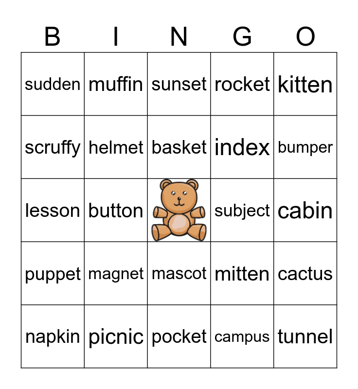 This bingo card has a free space and 24 words: magnet, picnic, basket, napkin, kitten, sudden, scruffy, muffin, subject, mascot, index, lesson, mitten, cactus, helmet, campus, cabin, sunset, bumper, button, tunnel, puppet, rocket and pocket.