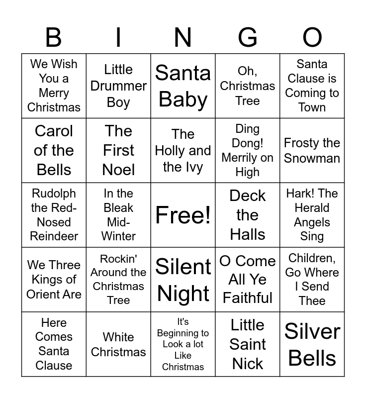 This bingo card has a free space and 43 words: Let it Snow, Silver Bells, Have Yourself a Merry Little Christmas, Here Comes Santa Clause, Do You Hear What I Hear?, Little Saint Nick, Santa Baby, Winter Wonderland, Santa Clause is Coming to Town, White Christmas, Oh, Christmas Tree, Deck the Halls, Silent Night, Rockin' Around the Christmas Tree, A Holly Jolly Christmas, It's Beginning to Look a lot Like Christmas, Joy to the World, Rudolph the Red-Nosed Reindeer, I'll Be Home for Christmas, Frosty the Snowman, Little Drummer Boy, Jingle Bells, It's the Most Wonderful Time of the Year, We Wish You a Merry Christmas, I Saw Three Ships, Hark! The Herald Angels Sing, O Holy Night, Go Tell It On The Mountain, O Come All Ye Faithful, We Three Kings of Orient Are, 12 Days of Christmas, Children, Go Where I Send Thee, Angels We Have Heard on High, In the Bleak Mid-Winter, O Come, O Come Emmanuel, O Little Town of Bethlehem, Away in a Manger, The Holly and the Ivy, Carol of the Bells, Ding Dong! Merrily on High, Good King Wenceslas, The First Noel and The Christmas Song (Chestnuts Roasting on an Open Fire).