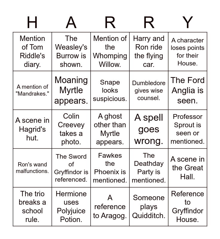 This bingo card has 60 words: Harry speaks Parseltongue., Hermione uses Polyjuice Potion., A character mentions "Muggle-borns.", Ron's wand malfunctions., Someone plays Quidditch., Hagrid gives advice., Moaning Myrtle appears., A scene in the Forbidden Forest., Dumbledore gives wise counsel., Gilderoy Lockhart boasts about himself., Harry and Ron ride the flying car., The term "Heir of Slytherin" is mentioned., A mention of "Mandrakes.", A scene in the Chamber of Secrets., The Sorting Hat appears., Mention of Tom Riddle's diary., A ghost other than Myrtle appears., A character loses points for their House., Someone mentions "Dobby.", Snape looks suspicious., A spell goes wrong., Mention of the Whomping Willow., The trio breaks a school rule., A scene in the Great Hall., The Basilisk is seen or mentioned., Harry uses the Invisibility Cloak., A character receives a Howler., A potion is brewed or mentioned., The Ford Anglia is seen., A character visits the hospital wing., A scene in McGonagall's classroom., Harry gets a detention., The Dueling Club is mentioned or shown., A scene in the Slytherin common room., The Weasley's Burrow is shown., Ginny Weasley appears nervous., A scene with Professor Lockhart teaching., Colin Creevey takes a photo., Nearly Headless Nick appears., A scene in Hagrid's hut., The Golden Snitch is mentioned., The Sword of Gryffindor is referenced., Professor Sprout is seen or mentioned., Cornish Pixies are mentioned., The Deathday Party is mentioned., A scene in the library., Professor Flitwick appears., A character mentions "Petrification.", The Mirror of Erised is mentioned., Fawkes the Phoenix is mentioned., A reference to Aragog., House-Elf rights are mentioned., A character uses a broomstick., Mention of "Parseltongue.", Lucius Malfoy appears., Reference to the previous year's events., Someone uses Floo Powder., A scene involving a spell book., Reference to Gryffindor House. and A character says "Expelliarmus.".