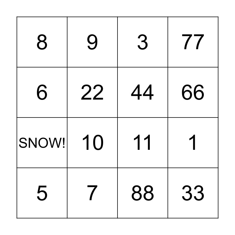This bingo card has 20 words: 1, 2, 3, 4, 5, 6, 7, 8, SNOW!, 9, 10, 11, 22, 33, 44, 55, 66, 77, 88 and 99.