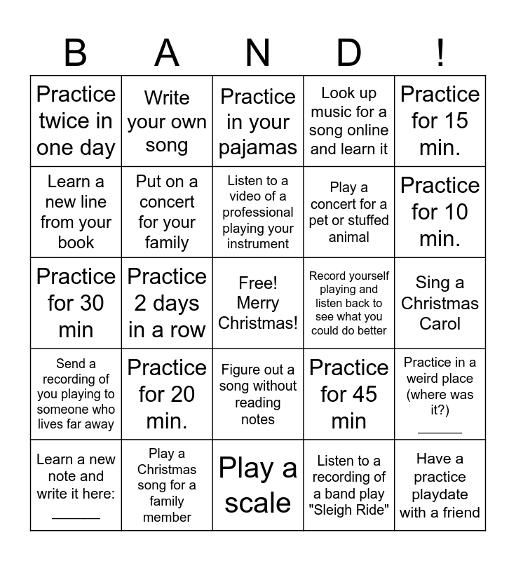 This bingo card has a free space and 24 words: Practice for 20 min., Play a Christmas song for a family member, Listen to a video of a professional playing your instrument, Learn a new note and write it here: ______, Practice for 15 min., Practice twice in one day, Learn a new line from your book, Write your own song, Record yourself playing and listen back to see what you could do better, Figure out a song without reading notes, Play a concert for a pet or stuffed animal, Practice for 30 min, Practice for 45 min, Practice in a weird place (where was it?) ______, Put on a concert for your family, Listen to a recording of a band play "Sleigh Ride", Sing a Christmas Carol, Practice in your pajamas, Practice for 10 min., Practice 2 days in a row, Have a practice playdate with a friend, Send a recording of you playing to someone who lives far away, Look up music for a song online and learn it and Play a scale.