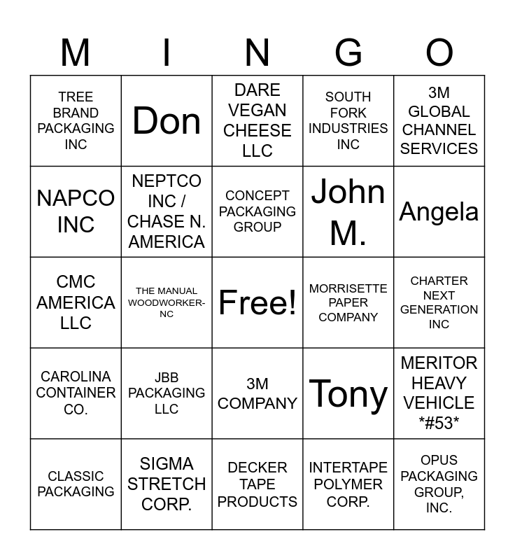 This bingo card has a free space and 125 words: ALLIANCE PLASTICS, AEROFLOW INC, MORRISETTE CUSTOM SERVICES, ETHAN ALLEN OPERATIONS INC, PCA BOX BOARD PRODUCTS,LLC, VLR LLC, CAROLINA CONTAINER CO., CENTURY FURNITURE *SLS#78*, INTERTAPE POLYMER CORP., DESIGN FOUNDRY LLC, RANPAK CORP., QEP COMPANY INC, PREGIS CORP., TENOWO INC, MORRISETTE FOAM, POPPY HANDCRAFTED POPCORN INC, SIGMA STRETCH CORP., TAGEOS INC, TRIOWORLD CORP., BORLA PERFORMANCE, IND INC, CMC AMERICA LLC, SUTTER STREET MFG (MS), RUSKEN PACKAGING SPARTANBURG, MAYO MANUFACTURING CORP, CONCEPT PACKAGING GROUP, SOUTH FORK INDUSTRIES INC, GEORGIA PACIFIC, HICKORY CHAIR COMPANY, CT COMMERCIAL PAPER LLC, MERITOR HEAVY VEHICLE *#53*, UNIVERSAL PACKAGING, THE MANUAL WOODWORKER-NC, JBB PACKAGING LLC, FMS ENTERPRISES USA INC, GP CORRUGATED LLC, ASHEVILLE KOMBUCHA, MAMAS LLC, LANTECH.COM, LLC, PRC INDUSTRIES INC, TREE BRAND PACKAGING INC, THE QUARTZ CORP USA, QUALITY PACKAGING CORP., BRP US INC, BADGER PAPERBOARD NC,LLC, SUTTER STREET MFG - NC, HENRY MOLDED PRODUCTS, 3M GLOBAL CHANNEL SERVICES, RESTORATION HARDWARE INC, HOOD CONTAINER CORPORATION, SAMOA CORPORATION, REPUBLIC BAG COMPANY, SEIREN NORTH AMERICA LLC, BOX PACKAGING, INC., VISTA HORTICULTURE GROUP INC, ZHONGCHENG PACKAGING USA, SAMARITAN'S PURSE, PAC WORLDWIDE CORP., ZRO DELTA, MORRISETTE PAPER COMPANY, NAPCO INC, MCLEAN PACKAGING CORP, VIKING TACTICS INC, T M POLY FILM INC., ECOLAB/NATIONAL WIPER *JE*, LADDAWN MANUFACTURING, TB ARHAUS LLC, 3M COMPANY, SIERRA NEVADA BREWING, CHARTER NEXT GENERATION INC, CLARK CONTAINER INC, LAGASSE BROS, INC., DODGE INDUSTRIAL, I.D. IMAGES, HUBBELL DISTRIBUTION INC, COMPLETE DESIGN PACKAGING LLC, KLEEN-TECH INC (NC), SIGNODE PACKAGING, VALLEN DIST - CORNING OPTICAL, ECO FIBER PACKAGING, TSG FINISHING LLC, EPSILON PLASTICS INC, MANNA FOODBANK, CLASSIC PACKAGING, NEPTCO INC / CHASE N. AMERICA, TEXWRAP PACKAGING SYSTEMS LLC, BUNCOMBE COUNTY SCHOOLS, AIR PROTECTION PACKAGING CORP, ADVANCEPIERRE FOODS SMN39, GEORGIA PACIFIC, NEW EXCELSIOR OF SIGMA PLASTIC, MORRISETTE PAPER COMPANY, INC., THE NORTHWEST GROUP LLC, QUAD INC., DARE VEGAN CHEESE LLC, DECKER TAPE PRODUCTS, CUSTOM PAK INC (NC LOC), STRAPACK, INC., LEGALLY ADDICTIVE FOODS LLC, OPUS PACKAGING GROUP, INC., DIGITAL CUTTING SERVICES INC, Tony, Josh, Jessica, Michael, Brian, Hannah, Angela, Anthony, George, Jackie, Danny, Vicki, Ty, Jamie, Tee, Pete, Brian H., Bill M., John M., Harrison, Tom C., Robbie W., Don and Randall.