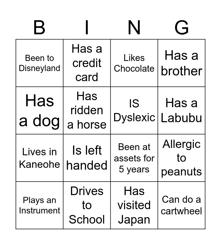 This bingo card has 16 words: Plays an Instrument, Drives to School, Likes Chocolate, Has a brother, Has a dog, Has a credit card, Been at assets for 5 years, Allergic to peanuts, Been to Disneyland, Has ridden a horse, Has visited Japan, Has a Labubu, Lives in Kaneohe, Is left handed, IS Dyslexic and Can do a cartwheel.