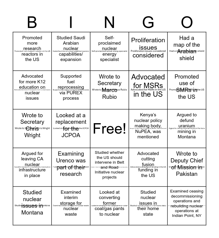 This bingo card has 24 images, a free space and 24 words: Studied nuclear issues in Montana, Examining Urenco was part of their research, Wrote to Secretary Marco Rubio, Studied nuclear issues in their home state, Had a map of the Arabian shield, Promoted more research reactors in the US, Studied Saudi Arabian nuclear capabilities/ expansion, Self-proclaimed nuclear energy specialist, Kenya’s nuclear policy making body, NuPEA, was mentioned, Argued to defund uranium mining in Montana, Wrote to Secretary Chris Wright, Supported fuel reprocessing via PUREX process, Advocated cutting fusion funding in the US, Wrote to Deputy Chief of Mission in Pakistan, Advocated for more K12 education on nuclear issues, Examined interim storage for nuclear waste, Looked at converting former coal/gas pants to nuclear, Proliferation issues considered, Promoted use of SMRs in the US, Argued for leaving CA nuclear infrastructure in place, Looked at a replacement for the JCPOA, Studied whether the US should intervene in Belt and Road Initiative nuclear projects, Advocated for MSRs in the US and Examined ceasing decommissioning operations and rebuilding nuclear operations at Indian Point, NY.