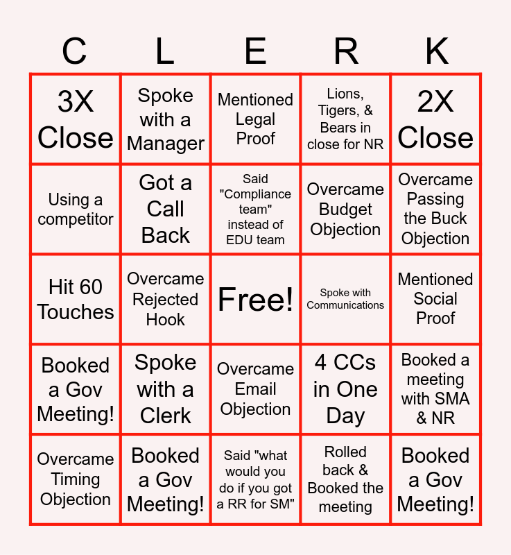 This bingo card has a free space and 24 words: Spoke with a Clerk, Booked a Gov Meeting!, Said "Compliance team" instead of EDU team, Overcame Timing Objection, 2X Close, 3X Close, Using a competitor, Spoke with a Manager, Spoke with Communications, Overcame Email Objection, Overcame Budget Objection, Hit 60 Touches, 4 CCs in One Day, Booked a meeting with SMA & NR, Got a Call Back, Rolled back & Booked the meeting, Mentioned Social Proof, Mentioned Legal Proof, Overcame Passing the Buck Objection, Overcame Rejected Hook, Booked a Gov Meeting!, Booked a Gov Meeting!, Lions, Tigers, & Bears in close for NR and Said "what would you do if you got a RR for SM".