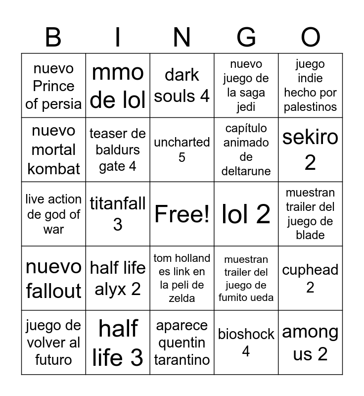 This bingo card has a free space and 24 words: half life alyx 2, half life 3, uncharted 5, juego de volver al futuro, juego indie hecho por palestinos, nuevo Prince of persia, nuevo mortal kombat, mmo de lol, lol 2, tom holland es link en la peli de zelda, capítulo animado de deltarune, live action de god of war, muestran trailer del juego de fumito ueda, cuphead 2, teaser de baldurs gate 4, bioshock 4, muestran trailer del juego de blade, dark souls 4, sekiro 2, titanfall 3, among us 2, nuevo fallout, nuevo juego de la saga jedi and aparece quentin tarantino.