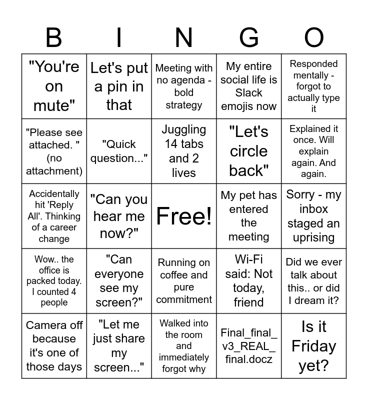 This bingo card has a free space and 24 words: "Can everyone see my screen?", "Let me just share my screen...", Juggling 14 tabs and 2 lives, Camera off because it's one of those days, Responded mentally - forgot to actually type it, "You're on mute", "Please see attached. "(no attachment), Let's put a pin in that, My pet has entered the meeting, Running on coffee and pure commitment, "Let's circle back", Accidentally hit 'Reply All'. Thinking of a career change, Wi-Fi said: Not today, friend, Did we ever talk about this.. or did I dream it?, "Quick question...", Final_final_ v3_REAL_ final.docz, Sorry - my inbox staged an uprising, Meeting with no agenda - bold strategy, Explained it once. Will explain again. And again., "Can you hear me now?", Is it Friday yet?, Wow.. the office is packed today. I counted 4 people, My entire social life is Slack emojis now and Walked into the room and immediately forgot why.