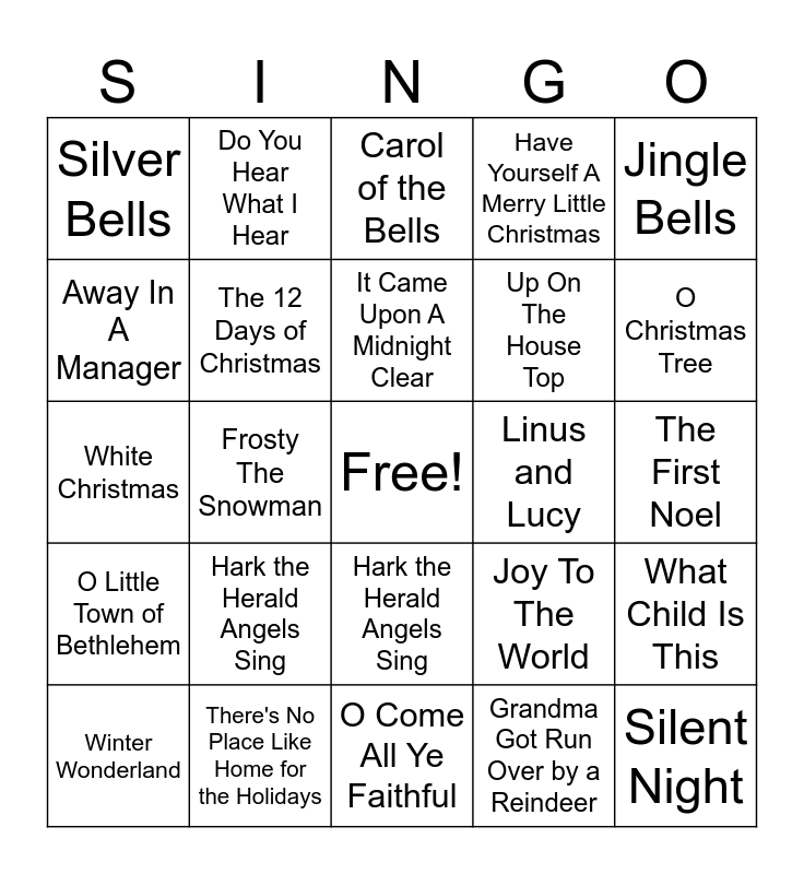 This bingo card has a free space and 29 words: Winter Wonderland, Deck The Hall, Frosty The Snowman, Rudolph the Red-Nosed Reindeer, Silver Bells, Carol of the Bells, The 12 Days of Christmas, Hark the Herald Angels Sing, Linus and Lucy, There's No Place Like Home for the Holidays, The First Noel, Silent Night, O Come All Ye Faithful, Grandma Got Run Over by a Reindeer, O Christmas Tree, Ho Ho Ho, Hark the Herald Angels Sing, O Little Town of Bethlehem, Jingle Bells, White Christmas, Joy To The World, Here comes Santa Claus, Up On The House Top, Away In A Manager, Have Yourself A Merry Little Christmas, Do You Hear What I Hear, What Child Is This, It Came Upon A Midnight Clear and We Three Kings.
