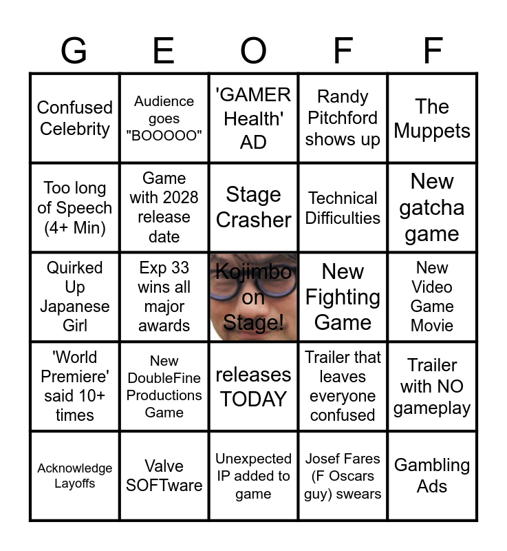 This bingo card has a free space and 24 words: New DoubleFine Productions Game, Valve SOFTware, Stage Crasher, Acknowledge Layoffs, The Muppets, Confused Celebrity, Too long of Speech (4+ Min), Audience goes "BOOOOO", New Fighting Game, releases TODAY, Technical Difficulties, Quirked Up Japanese Girl, Trailer that leaves everyone confused, Trailer with NO gameplay, Game with 2028 release date, Josef Fares (F Oscars guy) swears, New Video Game Movie, 'GAMER Health' AD, New gatcha game, Exp 33 wins all major awards, Gambling Ads, 'World Premiere' said 10+ times, Randy Pitchford shows up and Unexpected IP added to game.