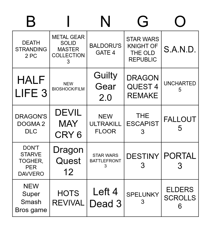 This bingo card has 25 words: Dragon Quest 12, Left 4 Dead 3, Guilty Gear 2.0, NEW Super Smash Bros game, S.A.N.D., DEATH STRANDING 2 PC, HALF LIFE 3, METAL GEAR SOLID MASTER COLLECTION 3, THE ESCAPIST 3, STAR WARS BATTLEFRONT 3, DRAGON QUEST 4 REMAKE, DRAGON'S DOGMA 2 DLC, DESTINY 3, PORTAL 3, NEW BIOSHOCK/FILM, ELDERS SCROLLS 6, FALLOUT 5, BALDORU'S GATE 4, UNCHARTED 5, DEVIL MAY CRY 6, NEW ULTRAKILL FLOOR, HOTS REVIVAL, DON'T STARVE TOGHER, PER DAVVERO, STAR WARS KNIGHT OF THE OLD REPUBLIC and SPELUNKY 3.