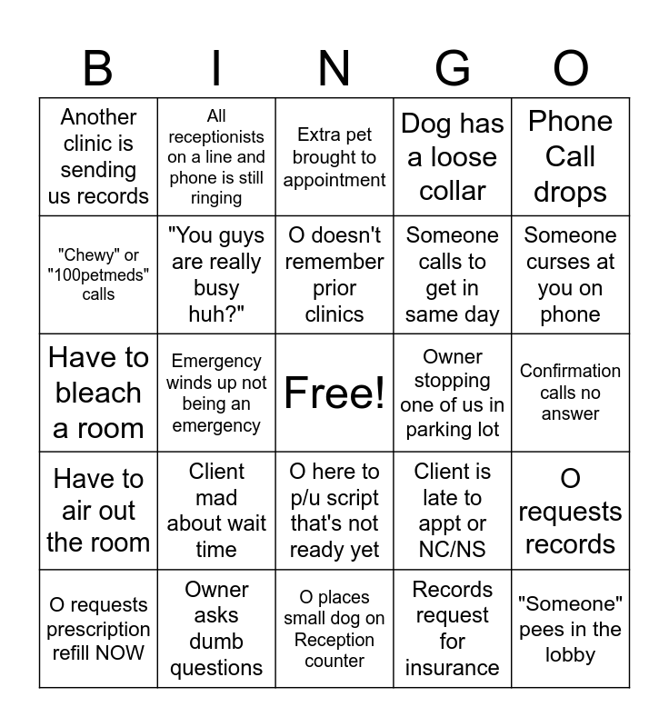 This bingo card has a free space and 24 words: Client mad about wait time, Owner asks dumb questions, O doesn't remember prior clinics, O requests prescription refill NOW, Phone Call drops, Another clinic is sending us records, "Chewy" or "100petmeds" calls, All receptionists on a line and phone is still ringing, Owner stopping one of us in parking lot, O here to p/u script that's not ready yet, Someone calls to get in same day, Have to bleach a room, Client is late to appt or NC/NS, O requests records, "You guys are really busy huh?", Records request for insurance, Confirmation calls no answer, Extra pet brought to appointment, Someone curses at you on phone, Emergency winds up not being an emergency, "Someone" pees in the lobby, Have to air out the room, Dog has a loose collar and O places small dog on Reception counter.