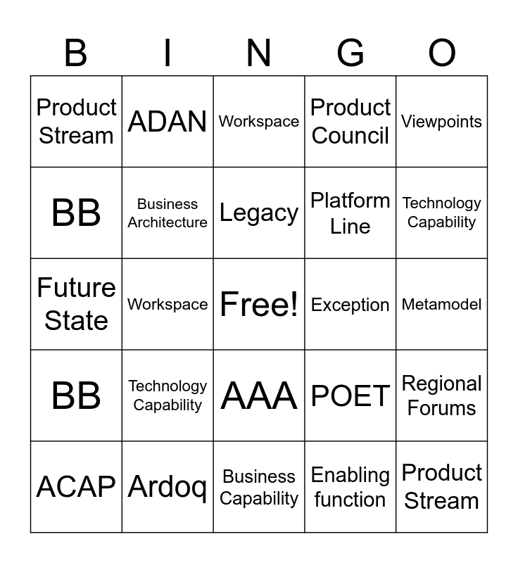 This bingo card has a free space and 47 words: Enabling function, Product Stream, Platform Line, Business Capability, Technology Capability, ACAP, ADAN, AAA, BB, Enterprise Architecture, Business Architecture, Product Council, Regional Forums, POET, Ardoq, Metamodel, Legacy, Exception, Reference, Viewpoints, Workspace, Enabling function, Product Stream, Platform Line, Business Capability, Technology Capability, ACAP, ADAN, AAA, BB, Enterprise Architecture, Business Architecture, Product Council, Regional Forums, POET, Ardoq, Metamodel, Legacy, Exception, Reference, Viewpoints, Workspace, Future State, Roadmap, Cloud Native, Agile and Pattern.