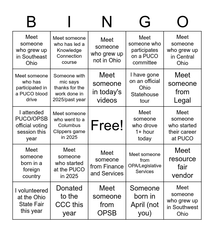 This bingo card has a free space and 62 words: Get photo taken at PUCO logo background, Donated to the CCC this year, Meet PUCO staff with 20+ years, Meet someone born in a foreign country, Attended 2 or more PUCO Knowledge Connections this year, Attended one or more MAPS classes, Someone with mic says thanks for the work done in 2025/past year, Meet someone with LeanOhio certification, I have gone on an official Ohio Statehouse tour, Someone’s phone rings during the All Staff meeting, Meet someone who participates on a PUCO committee, Meet someone who attended a professional sporting event, Meet someone who has participated in a PUCO blood drive, Meet someone who grew up in Northwest Ohio, Meet someone who grew up in Northeast Ohio, Meet someone who grew up in Southeast Ohio, Meet someone who grew up in Southwest Ohio, Meet someone who grew up in Central Ohio, Meet someone you didn’t know before today, Meet someone in today's videos, Meet someone who drove 1+ hour today, Meet someone who grew up not in Ohio, I volunteered at the Ohio State Fair this year, Someone born in April (not you), Reshare a PUCO social media post, Everyone claps, Play all staff trivia, Brought a canned good today, Meet resource fair vendor, Meet a department director, Meet a pickleball player, Ask someone “What is your favorite holiday?”, Ask someone “What is your favorite season?”, Coffee runs out, Meet someone who started their career at PUCO, Meet someone who has led a Knowledge Connection course, Meet someone serving in the armed forces, Meet a veteran, Meet someone who went to a Columbus Clippers game in 2025, Follow @PUCOhio on Facebook, X, and Insta, I attended PUCO/OPSB official voting session this year, Meet someone who traveled outside the U.S. in 2025, Meet someone who started at the PUCO in 2025, Someone wearing a PUCO shirt, Meet someone from Legal, Meet someone from OPA/Legislative Services, Meet someone from SMED, Meet someone from Docketing, Meet someone from Commission Offices, Meet someone from Federal Energy Advocate, Meet someone from Finance and Services, Meet someone from OPSB, Meet someone from IT, Meet a member of the Transportation, Meet someone from Rates and Analysis, Meet someone from Human Resources, Meet someone who has a pet, Find someone who speaks more than one language, Find someone who shares a birthday month with you, Find someone who has gone to a concert in 2025, Find someone who is a SCUBA certified and Find someone who has run a marathon..