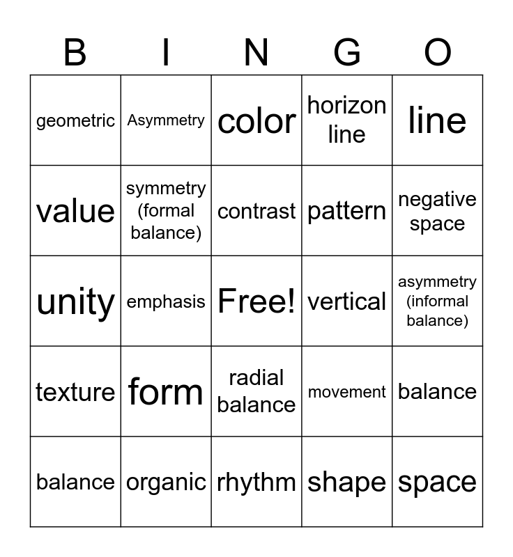 This bingo card has a free space and 29 words: balance, proportion, emphasis, harmony, geometric, color, symmetry (formal balance), form, vertical, organic, asymmetry (informal balance), space, rhythm, shape, negative space, positive space, radial balance, texture, line, unity, movement, variety, pattern, value, horizon line, Asymmetry, balance, contrast and scale.