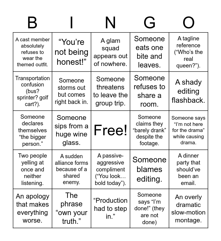 This bingo card has a free space and 32 words: Someone says “I’m done!” (they are not done), Accusations of “talking behind my back.”, Someone sips from a huge wine glass., A dramatic walk-off that lasts less than 30 seconds., Two people yelling at once and neither listening., Someone storms out but comes right back in., A tagline reference (“Who’s the real queen?”)., A dinner party that should’ve been an email., “You’re not being honest!”, A housewife says “I don’t start fights, I finish them.”, Someone threatens to leave the group trip., A glam squad appears out of nowhere., A sip-and-side-eye moment., Crew members flirt when they definitely shouldn’t., Someone claims they “barely drank” despite the footage., A messy after-shift night out., An apology that makes everything worse., Someone declares themselves “the bigger person.”, A passive-aggressive compliment (“You look… bold today”)., A sudden alliance forms because of a shared enemy., Someone blames editing., A pet makes a cameo (bonus if it’s wearing clothes)., Someone says “I’m not here for the drama” while causing drama., The phrase “own your truth.”, An overly dramatic slow-motion montage., Someone eats one bite and leaves., Someone refuses to share a room., Transportation confusion (bus? sprinter? golf cart?)., A cast member absolutely refuses to wear the themed outfit., “Production had to step in.”, A toast that ends with someone crying. and A shady editing flashback..