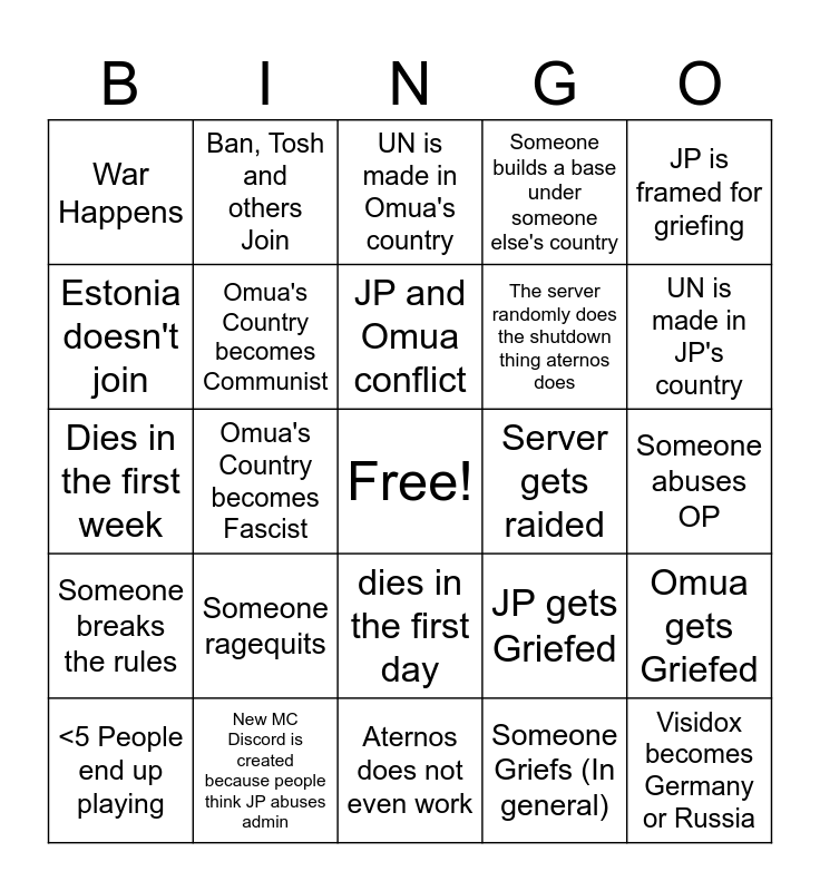 This bingo card has a free space and 24 words: Someone ragequits, New MC Discord is created because people think JP abuses admin, JP and Omua conflict, <5 People end up playing, JP is framed for griefing, War Happens, Estonia doesn't join, Ban, Tosh and others Join, Server gets raided, dies in the first day, The server randomly does the shutdown thing aternos does, Dies in the first week, JP gets Griefed, Omua gets Griefed, Omua's Country becomes Communist, Someone Griefs (In general), Someone abuses OP, UN is made in Omua's country, UN is made in JP's country, Omua's Country becomes Fascist, Visidox becomes Germany or Russia, Someone breaks the rules, Someone builds a base under someone else's country and Aternos does not even work.