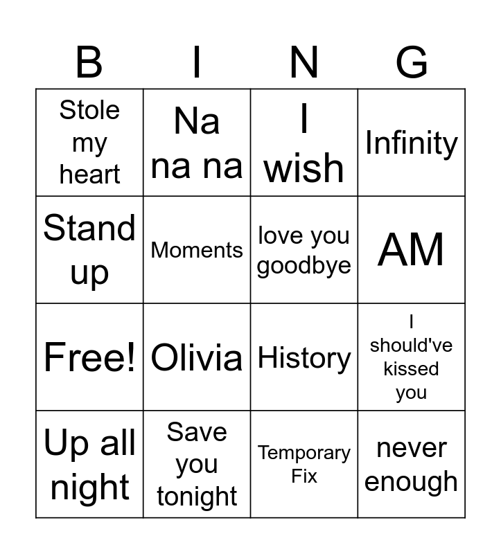 This bingo card has 20 words: I should've kissed you, I want, I wish, one thing, Up all night, Stand up, Save you tonight, Stole my heart, Free!, Na na na, Olivia, History, Moments, never enough, love you goodbye, hey angel, AM, Infinity, Temporary Fix and Wolves.