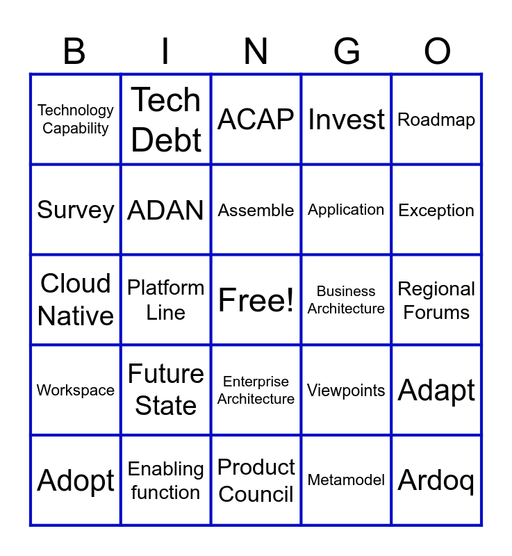 This bingo card has a free space and 30 words: Enabling function, Product Stream, Platform Line, Business Capability, Technology Capability, ACAP, ADAN, Enterprise Architecture, Business Architecture, Product Council, Regional Forums, Ardoq, Metamodel, Legacy, Exception, Reference, Viewpoints, Workspace, Future State, Roadmap, Cloud Native, Pattern, Tech Debt, Application, Survey, Invest, Adapt, Adopt, Assemble and Buy and Build.