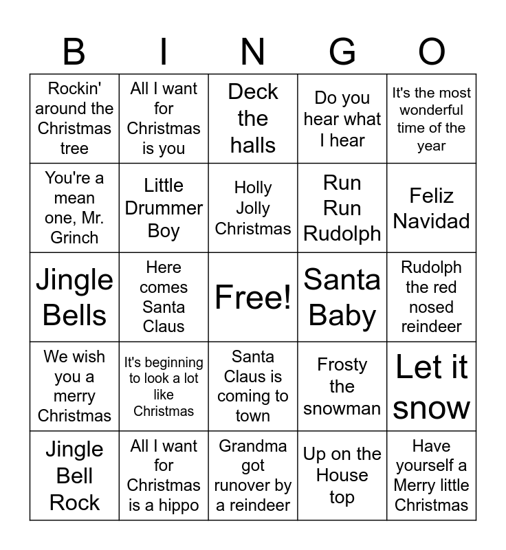 This bingo card has a free space and 24 words: It's beginning to look a lot like Christmas, All I want for Christmas is a hippo, Holly Jolly Christmas, Jingle Bell Rock, It's the most wonderful time of the year, Rockin' around the Christmas tree, You're a mean one, Mr. Grinch, All I want for Christmas is you, Santa Baby, Santa Claus is coming to town, Run Run Rudolph, Jingle Bells, Frosty the snowman, Let it snow, Little Drummer Boy, Up on the House top, Rudolph the red nosed reindeer, Deck the halls, Feliz Navidad, Here comes Santa Claus, Have yourself a Merry little Christmas, We wish you a merry Christmas, Do you hear what I hear and Grandma got runover by a reindeer.