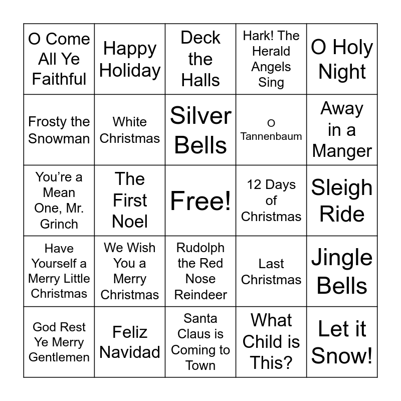 This bingo card has a free space and 37 words: Jingle Bell Rock, Rocking Around the Christmas Tree, Here Comes Santa Claus, White Christmas, Jingle Bells, We Wish You a Merry Christmas, Silver Bells, Little Drummer Boy, O Holy Night, Silent Night, The First Noel, Hark! The Herald Angels Sing, Let it Snow!, Sleigh Ride, Frosty the Snowman, Have Yourself a Merry Little Christmas, Blue Christmas, Deck the Halls, Rudolph the Red Nose Reindeer, 12 Days of Christmas, O Come All Ye Faithful, Away in a Manger, God Rest Ye Merry Gentlemen, Santa Claus is Coming to Town, Little Saint Nick, What Child is This?, Happy Holiday, It’s Beginning to Look a lot like Christmas, Run Rudolph Run, Holly Jolly Christmas, It’s the Most Wonderful Time of the Year, Feliz Navidad, You’re a Mean One, Mr. Grinch, We Three Kings, Last Christmas, O Tannenbaum and The Christmas Song (Chestnuts Roasting on an Open Fire).