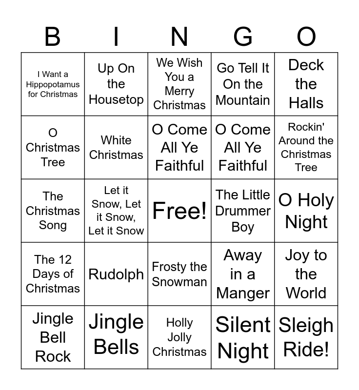 This bingo card has a free space and 24 words: Rudolph, Jingle Bells, O Come All Ye Faithful, Jingle Bell Rock, Deck the Halls, I Want a Hippopotamus for Christmas, O Christmas Tree, Up On the Housetop, The Little Drummer Boy, Frosty the Snowman, O Come All Ye Faithful, The Christmas Song, Away in a Manger, Joy to the World, White Christmas, Silent Night, O Holy Night, We Wish You a Merry Christmas, Rockin' Around the Christmas Tree, Let it Snow, Let it Snow, Let it Snow, Sleigh Ride!, The 12 Days of Christmas, Go Tell It On the Mountain and Holly Jolly Christmas.