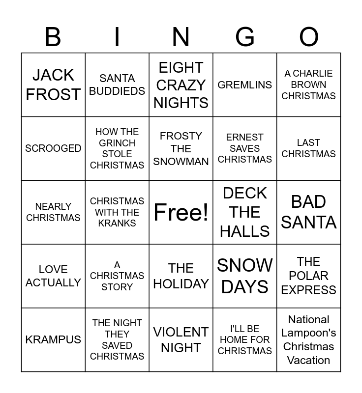 This bingo card has a free space and 37 words: HOME ALONE, ELF, THE SANTA CLAUSE, HOW THE GRINCH STOLE CHRISTMAS, THE POLAR EXPRESS, A CHRISTMAS STORY, FROSTY THE SNOWMAN, RUDOLPH THE RED NOSED REINDEER, A CHARLIE BROWN CHRISTMAS, THE NIGHTMARE BEFORE CHRISTMAS, CHRISTMAS WITH THE KRANKS, GREMLINS, National Lampoon's Christmas Vacation, BAD SANTA, SCROOGED, LOVE ACTUALLY, JINGLE ALL THE WAY, EIGHT CRAZY NIGHTS, THE HOLIDAY, DECK THE HALLS, JACK FROST, LAST CHRISTMAS, KRAMPUS, VIOLENT NIGHT, HOME ALONE 2, I'LL BE HOME FOR CHRISTMAS, SANTA BUDDIEDS, FOUR CHRISTMASES, NOELLE, DADDY'S HOME 2, CHRISTMAS CHRONICLES, THE NIGHT THEY SAVED CHRISTMAS, NEARLY CHRISTMAS, A CHRISTMAS GIFT FROM BOB, SNOW DAYS, ERNEST SAVES CHRISTMAS and IT'S A SPONGEBOB CHRISTMAS!.