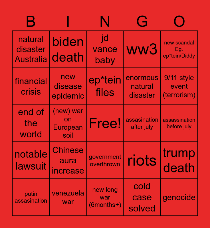 This bingo card has a free space and 24 words: Chinese aura increase, venezuela war, ep*tein files, putin assasination, new scandal Eg. ep*tein/Diddy, natural disaster Australia, financial crisis, biden death, assasination after july, government overthrown, enormous natural disaster, end of the world, riots, trump death, new disease epidemic, cold case solved, assassination before july, jd vance baby, 9/11 style event (terrorism), (new) war on European soil, genocide, notable lawsuit, ww3 and new long war (6months+).