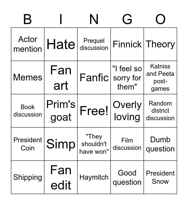 This bingo card has a free space and 24 words: Simp, Fan edit, Fanfic, Shipping, Theory, Actor mention, Memes, Hate, Overly loving, "They shouldn't have won", "I feel so sorry for them", Book discussion, Film discussion, Dumb question, Fan art, Good question, Random district discussion, Prequel discussion, Katniss and Peeta post-games, Prim's goat, President Snow, President Coin, Finnick and Haymitch.