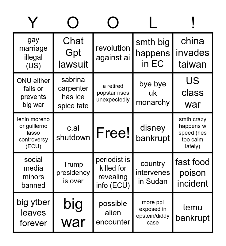 This bingo card has a free space and 24 words: Trump presidency is over, big war, a retired popstar rises unexpectedly, big ytber leaves forever, china invades taiwan, gay marriage illegal (US), ONU either fails or prevents big war, Chat Gpt lawsuit, disney bankrupt, periodist is killed for revealing info (ECU), bye bye uk monarchy, lenin moreno or guillerno lasso controversy (ECU), country intervenes in Sudan, fast food poison incident, sabrina carpenter has ice spice fate, more ppl exposed in epstein/diddy case, smth crazy happens w speed (hes too calm lately), revolution against ai, US class war, c.ai shutdown, temu bankrupt, social media minors banned, smth big happens in EC and possible alien encounter.