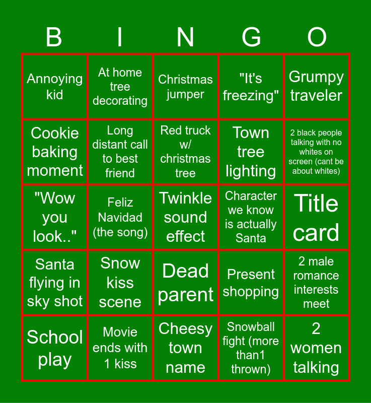 This bingo card has 25 words: Snow kiss scene, Cheesy town name, Red truck w/ christmas tree, School play, Grumpy traveler, Annoying kid, Cookie baking moment, At home tree decorating, Character we know is actually Santa, Dead parent, Town tree lighting, "Wow you look..", Present shopping, 2 male romance interests meet, Long distant call to best friend, 2 women talking, Title card, Christmas jumper, 2 black people talking with no whites on screen (cant be about whites), Feliz Navidad (the song), Twinkle sound effect, Movie ends with 1 kiss, Santa flying in sky shot, "It's freezing" and Snowball fight (more than1 thrown).